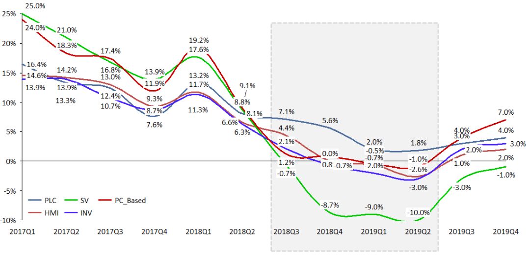 伺服产品市场增长快速下跌,2019年首次跌破零。