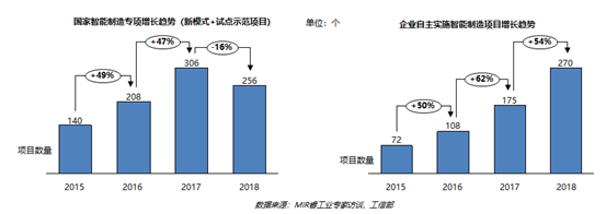 国内外市场的不确定因素正在增加,企业面临越来越大的生存和盈利压力,降成本、提升生产效率是促进企业健康发展的关键,而数字化、智能化生产是解决此问题的有力举措,因此企业期望通过投资数字化工厂或数字化车间、对现有的生产模式进行升级改造。目前来看,企业自主投资的智能制造项目数量已超过国家智能制造专项,国家专项的引导模式已不是中国智能制造发展的唯一引擎。