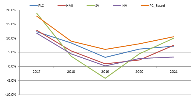 观点2:2018至2019年各自动化产品增长率持续降低,其中伺服增长率2019年首次跌破零,PC-Based产品市场表现较好